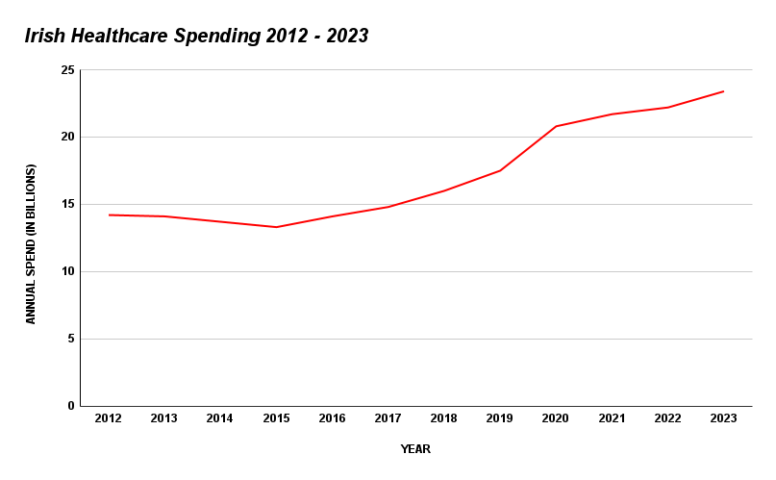 In 2012, Ireland spent €14.2 billion on healthcare, compared to €24.4 billion in the latest budget – an increase of roughly €10 billion.