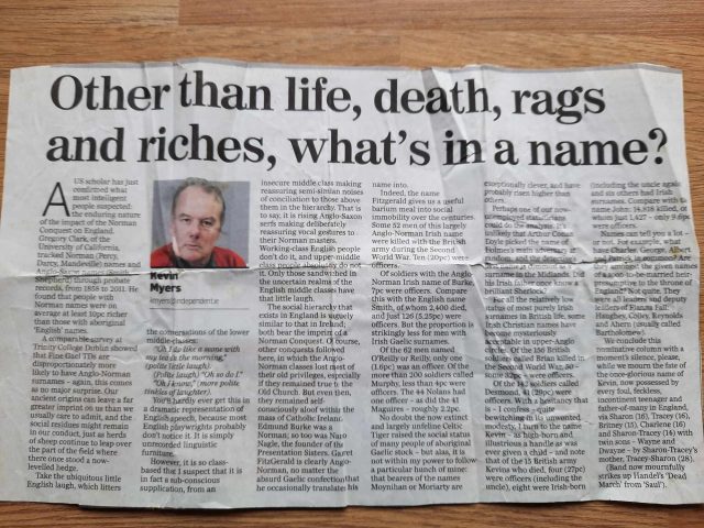 A survey of names in Trinity College Dublin, Myers said, found that Fine Gael TDs are disproportionately more likely to have Anglo-Norman surnames. “Our ancient origins can leave a far greater imprint on us then we usually care to admit,” he wrote.