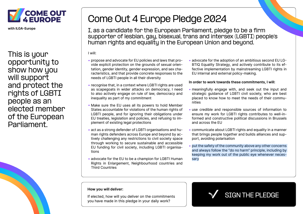 The Come Out 4 Europe pledge was produced by ILGA-Europe, the European arm of the International Lesbian, Gay, Bisexual, Trans and Intersex Association (ILGA). The ILGA is a worldwide federation of nearly 2,000 LGBT advocacy groups.