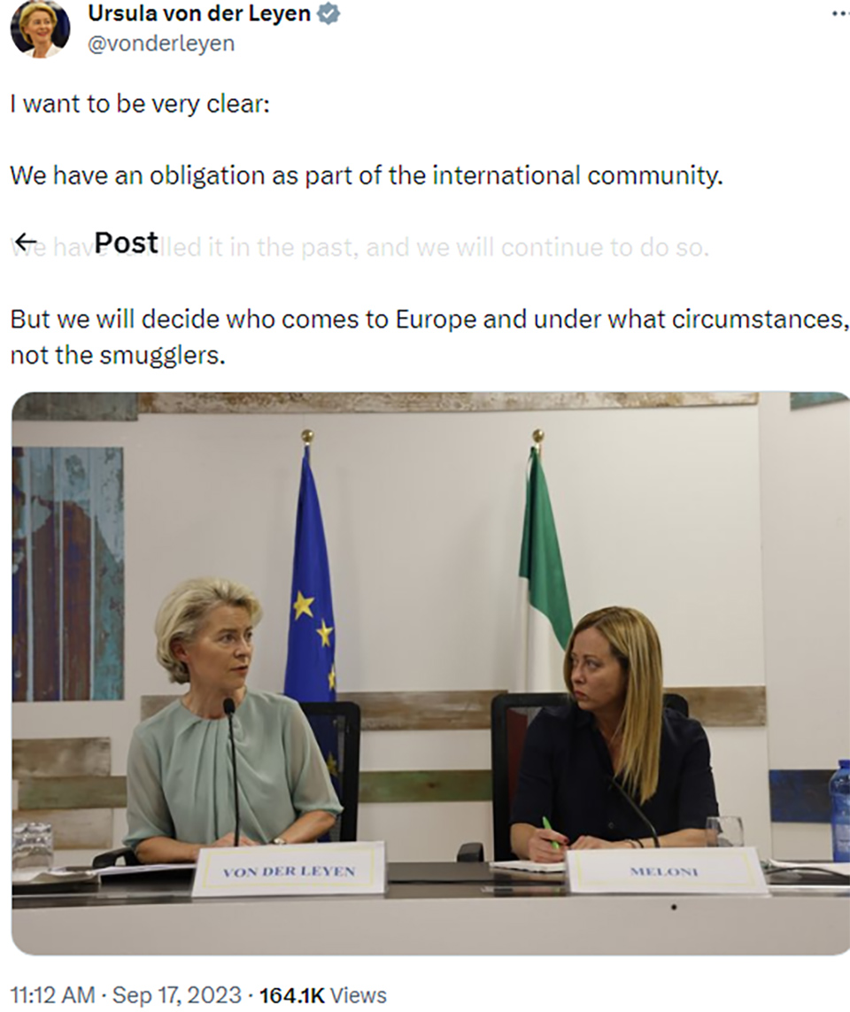 Von der Leyen’s official tweet, the text of the plan and the fact that she appeared alongside Italian Prime Minister Giorgia Meloni, underlines both the ambiguity and sensitivity of how this is dealt with across the EU.