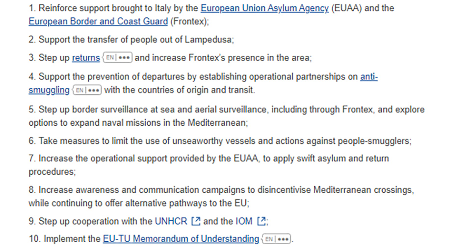 The Memorandum of Understanding whose implementation is referred to in Point 10 of the EU plan is the one agreed on July 16 this year between the EU and the government of Tunisia. Having set out a range of economic assistance to Tunisia, the meat of the Memo deals with measures designed to curb the transit of illegal immigrants from Tunisia.