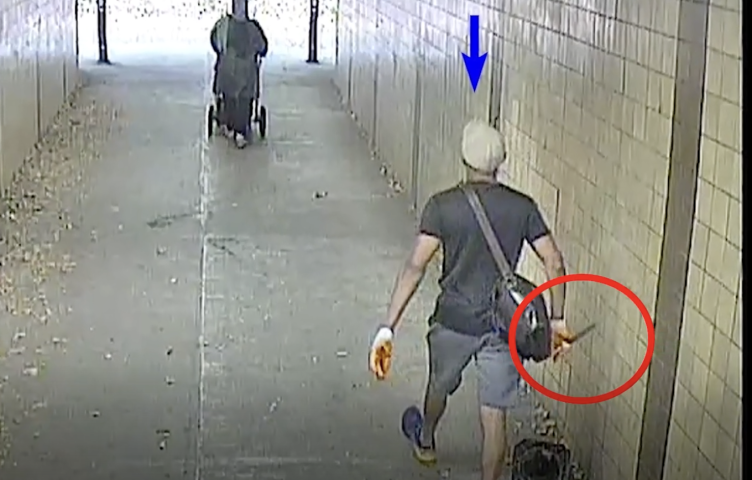 Moments before he attacked Thomas, Byer was captured passing a woman pushing a buggy with the knife he used to take the pensioner’s life clearly visible in his right hand.