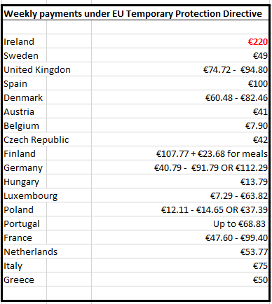 In relation to Ireland, it states that Ukrainians living here under the Temporary Protection Directive are entitled to a payment of €220 weekly. Other EU states and the UK pay between €7.90 and €131.45 per week, with most countries limiting payments where accommodation and supports are provided.