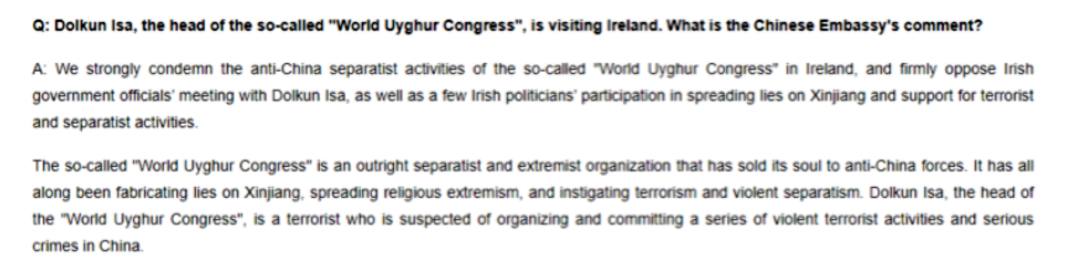 The reaction of the Chinese Embassy in Dublin to the meeting of representatives of the World Uyghur Congress with United Nations Rapporteur Mary Lawlor Department of Foreign Affairs officials was interesting.