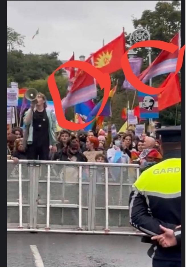 Figure 2: Far-left activists protesting the Let Women Speak event on 16th Sept 2023 in Dublin. Circled are Communist flags with “transgender” colours on them. To the right is Communist leader Vladimir Lenin’s face overlaid on “transgender” colours.