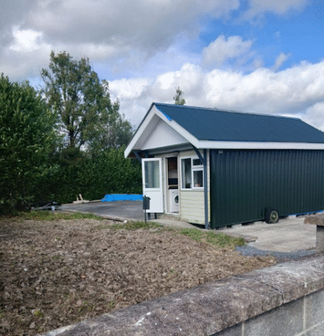 According to the listing on Daft.ie, the unit provides basic self-contained facilities, including a small kitchenette featuring a hob and a tiny bathroom. Images from the listing show bare soil patches and a blue tarp in the yard nearby outside.