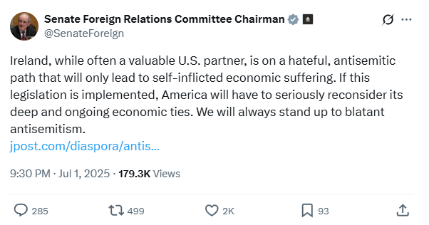 The Senate Foreign Relations Committee does not have executive powers in the way that President Trump does, or in the way that Secretary of State Rubio does. But in some ways, the powers that Risch has at his command are much more troubling: It is Senator Risch, not President Trump or Secretary Rubio, who can summon US companies to Capitol Hill for Congressional Hearings, and make life difficult in all sorts of ways for companies that invest in Ireland, or are planning to so invest.