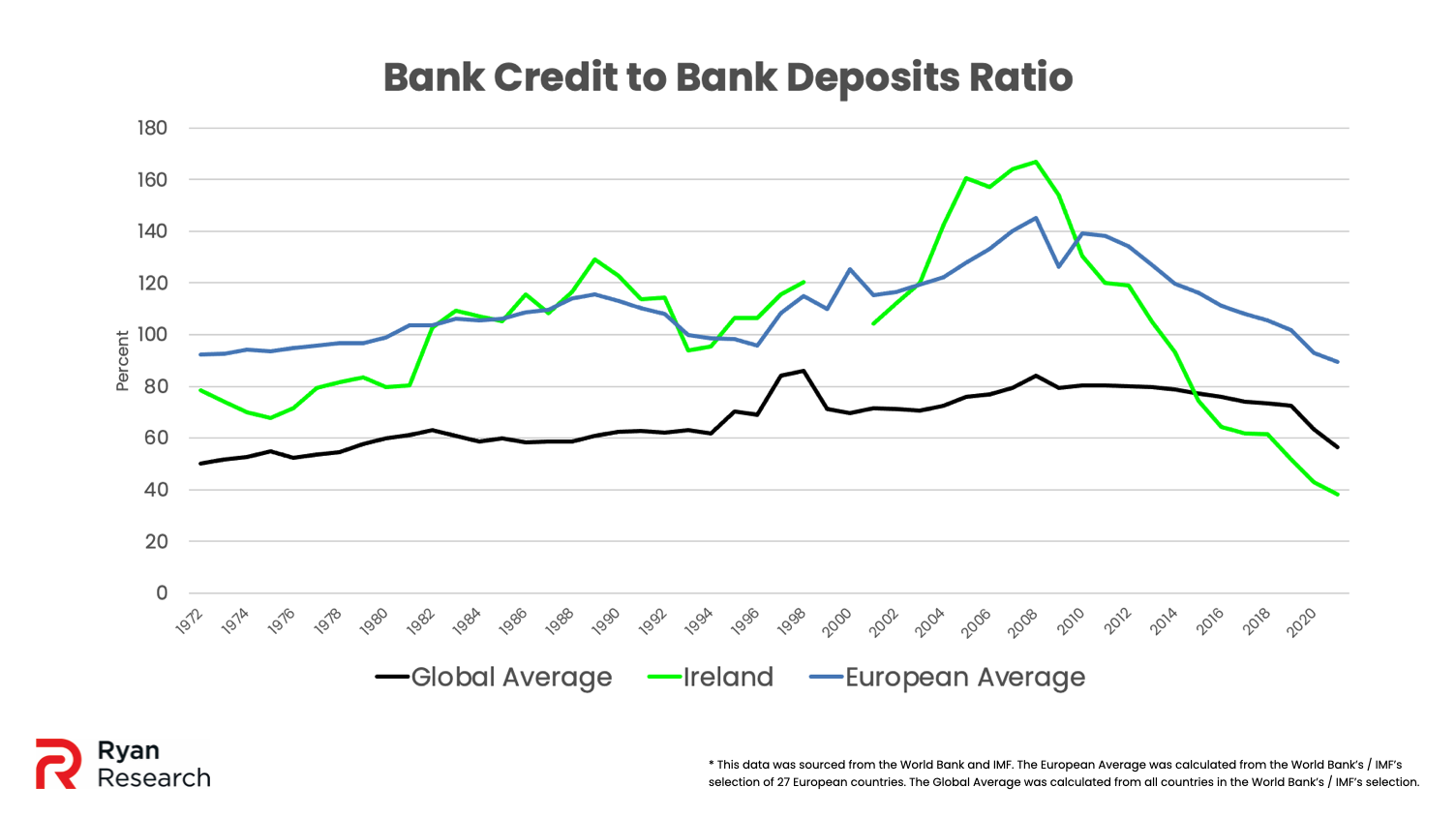 While it’s easy to see how credit could be expanded too much relative to deposits, too little credit relative to deposits can also spell problems. The following data was collected from the U.S. Federal Reserve, the International Monetary Fund (IMF), the World Bank, and the Irish Central Statistics Office (CSO).
