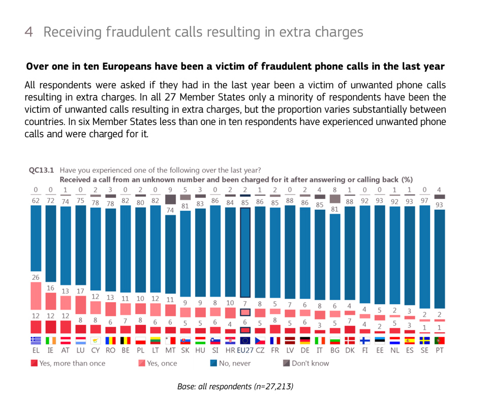 A new Eurobarometer survey reveals that more than 1 in 4 Irish people (28%) have received a call from an unknown number and been charged for it after answering the call or calling back over the last year, the 2nd highest share in the EU after Greece and over double the EU average of 13%.