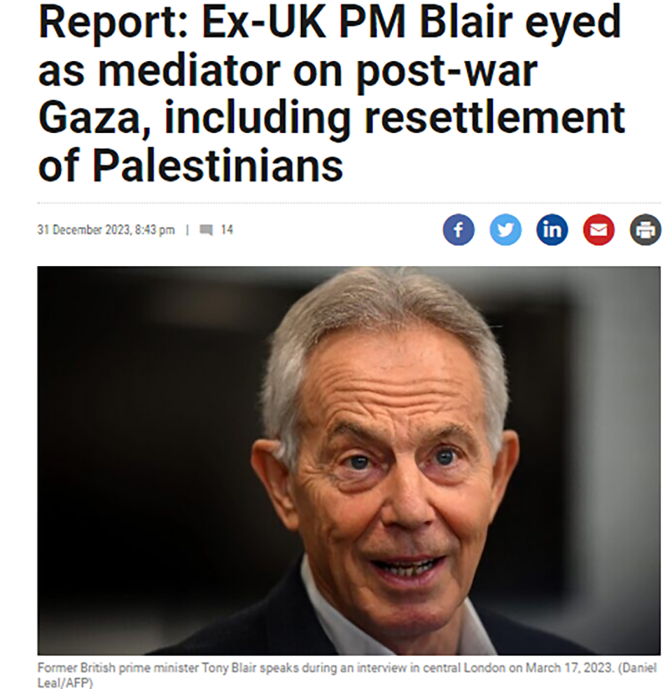 On Sunday, The Times of Israel reported that former British Prime Minister, Tony Blair, had been asked by the Israeli government to act as a mediator with states who the Israelis were planning to request to take refugees from the conflict in Gaza. Blair had been in Jerusalem where he had met with Prime Minister Benjamin Netanyahu.