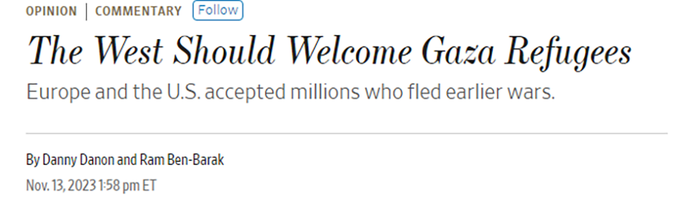 This theme has gained increasing prominence since the Hamas attacks led to the Israeli assault on Gaza. In November the Wall Street Journal published an op-ed jointly written by a member of the ruling party Likud and a member of the opposition liberal secularist Yesh Atid arguing for the west to take displaced Palestinians.