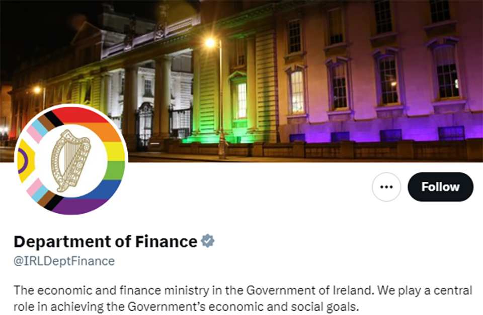 This now plays out in some truly bizarre sights like Ireland’s Department of Finance changing its social media logo to a rainbow theme for the month of June. Once better known for its exacting instinct for fiscal probity, Ireland’s taxpayer funded Department of Finance is these days busy aligning itself with gender ideology, an increasingly contested and disputed ideology.