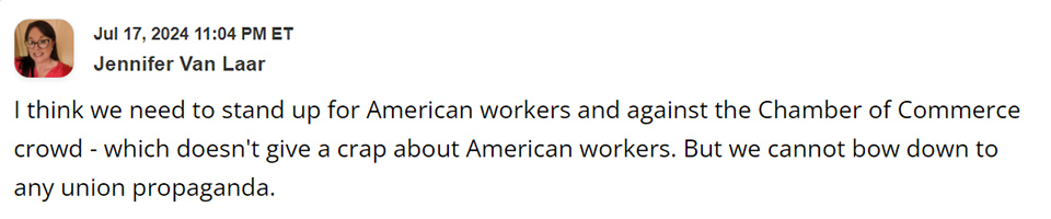 The suspicion of the mostly Democrat controlled unions remains strong as evidenced by the comment of Red State’s Jennifer Van Laar. It is a disjunct between the radical conservative sympathy for the working class and antipathy towards the union bureaucracy. Both in the United States and here that bureaucracy and the paid activists privilege liberal causes which not only have nothing to do with protecting the position of their members but which – most glaringly in the case of mindless union parroting of the establishment line on mass immigration -are inimical to those interests.