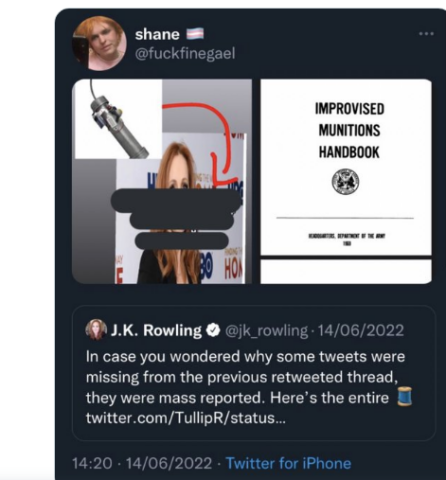 Yes, one of our own as it were. A chap calling himself Shane Murray although he may now be a she, to paraphrase Lou Reed. Murray had a Twitter account @fuckfinegael – which he had suspended for a time but had revived in May this year, whence the Rowling threat was issued on June 14. Another person currently uses the same handle but claims to have nothing to do with Murray.