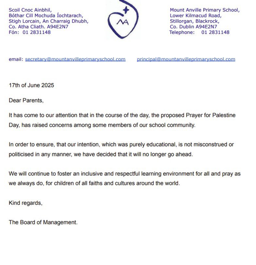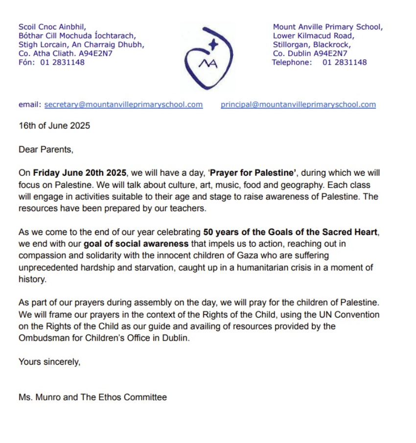On Monday, Mount Anville Primary School issued a letter to all parents informing “the school community” that Friday, June 20th, would be “Prayer for Palestine” day, during which the school would “focus on Palestine”.