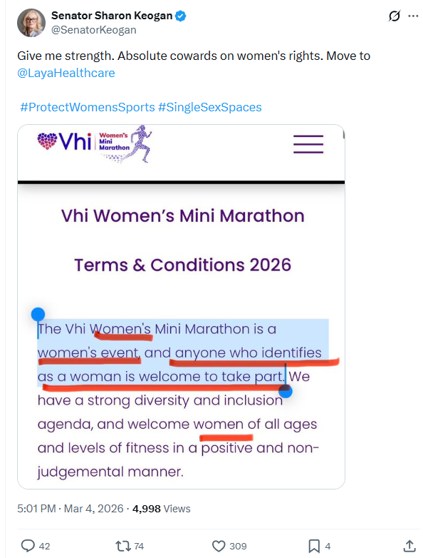 Yesterday, it was announced that it is no longer the women’s mini marathon. Blokes can now enter it too, so long as they “identify” as women. Senator Sharon Keogan was amongst the great number of women less than impressed, taking particular aim at the event’s sponsor, the VHI: