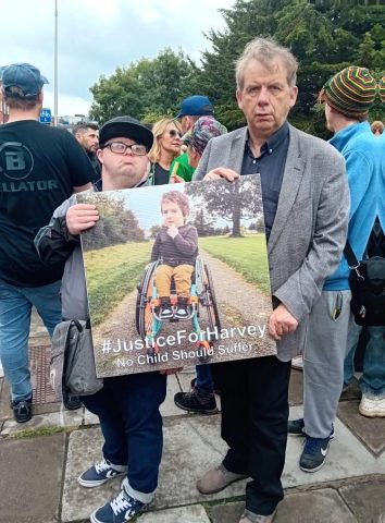 Long-time disability advocates attended the march hoping for change – with well-known campaigners Michael and Conor O’Dwod posting: “At the protest today for Harvey. One of the most poignant banners read simply’ I was only a child’.”