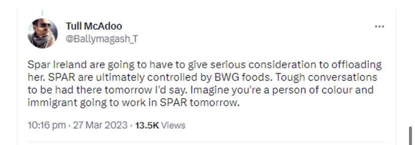 Talk about passive aggression boys. Looking at that comment it’s hard not to believe that his intent is to say that Kellie Harrington is not really entitled to her “opinion on immigration” – once again no reference to her actual tweet – and that he as a man with some influence and power is basically demanding or implying that Spar Ireland ought to perhaps dump her. Indeed.