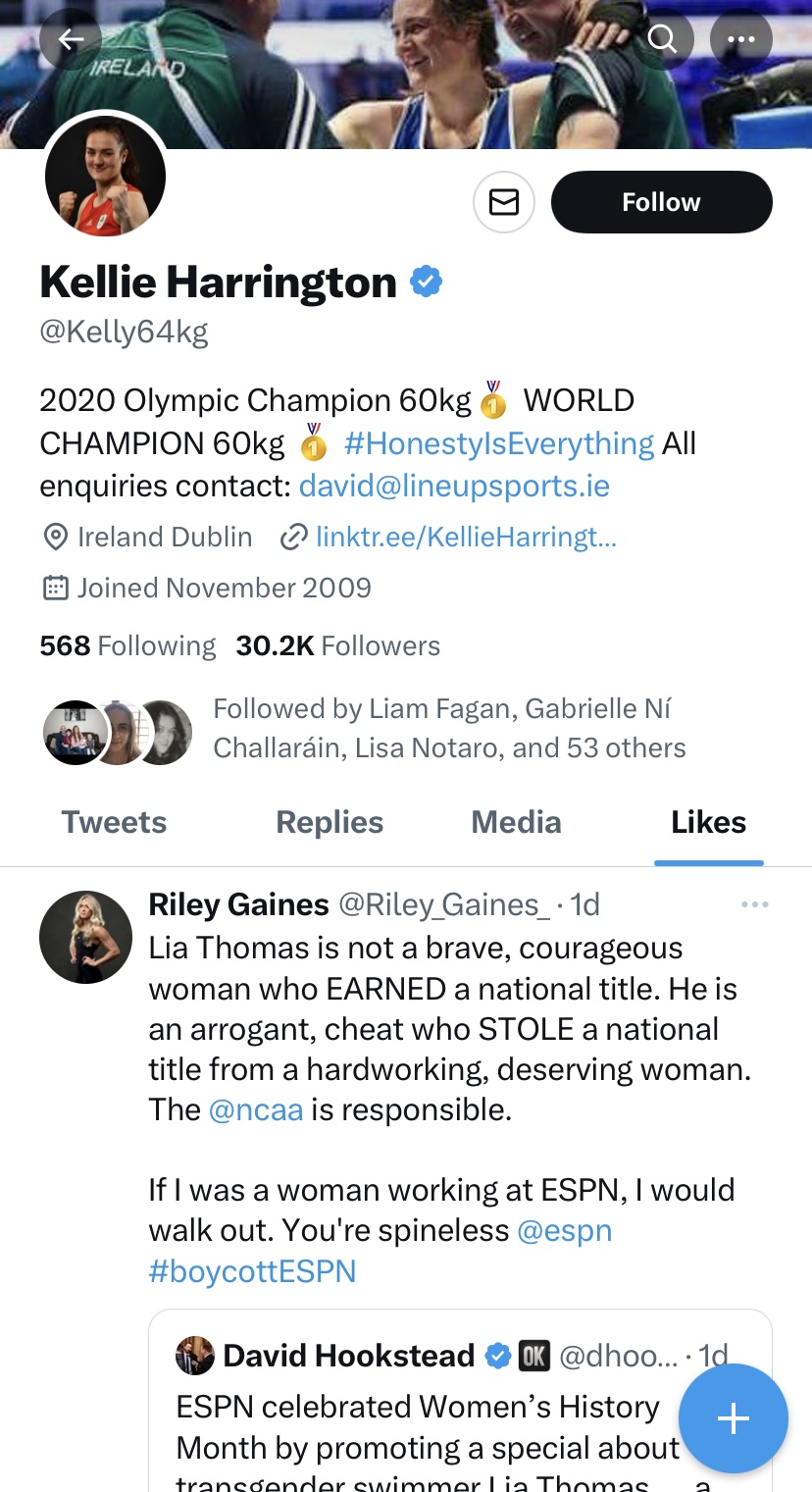 Others have dismissed Harrington’s statement and have moved onto portraying her as “transphobic.” The evidence for this being Harrington’s liking a tweet which rightly “called out” the celebratory leftie nonsense about Lia Thomas – a biological male who recently won an American NCAA division one title in women’s swimming.