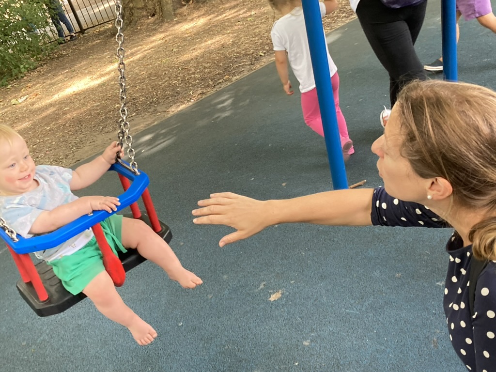(Me, pushing my toddler (John) on a swing, and actually enjoying it. A bit)