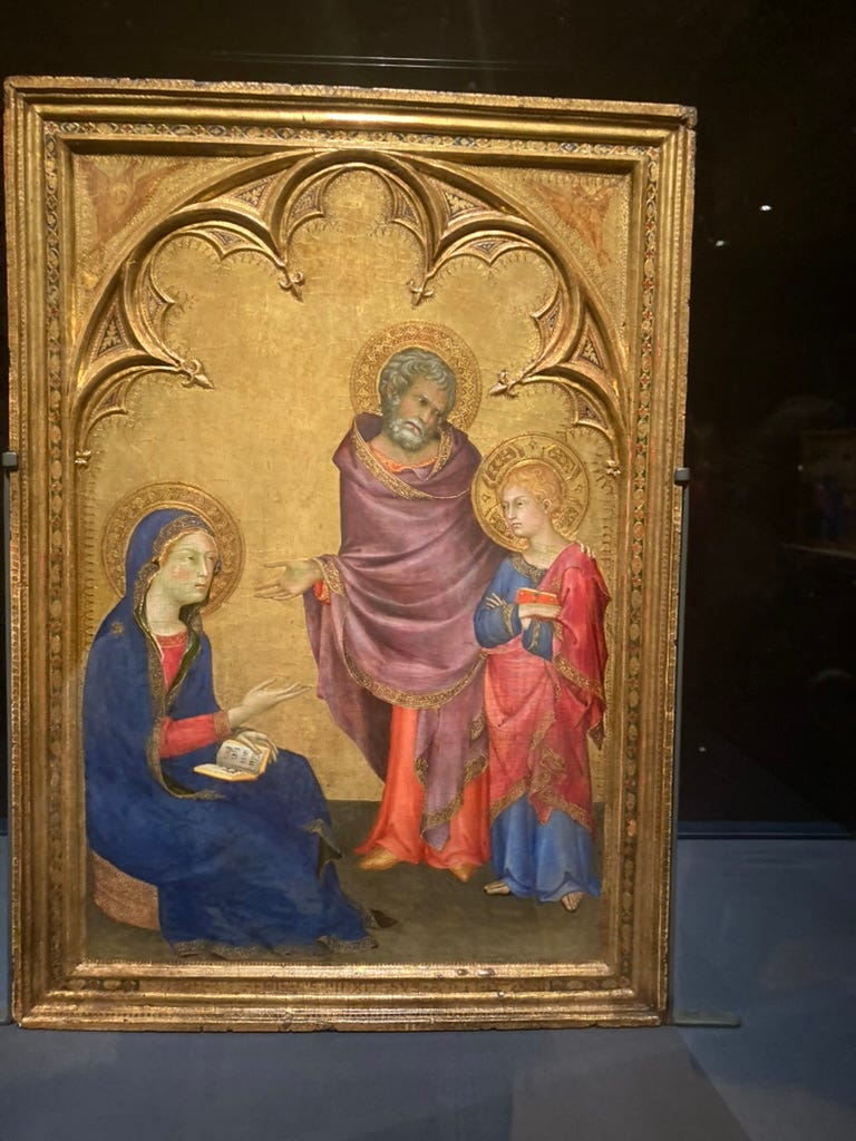 I saw the Siena exhibition at the National Gallery a few weeks ago. The above is Christ Discovered in the Temple. 1342, by Simone Martini. As a child, Christ abandoned his parents during a visit to the Temple in Jerusalem and stayed behind to teach among the scholars there. His mother’s words on finding him again are written in Latin on the book she holds: ‘Son, why have you dealt with us like this?’