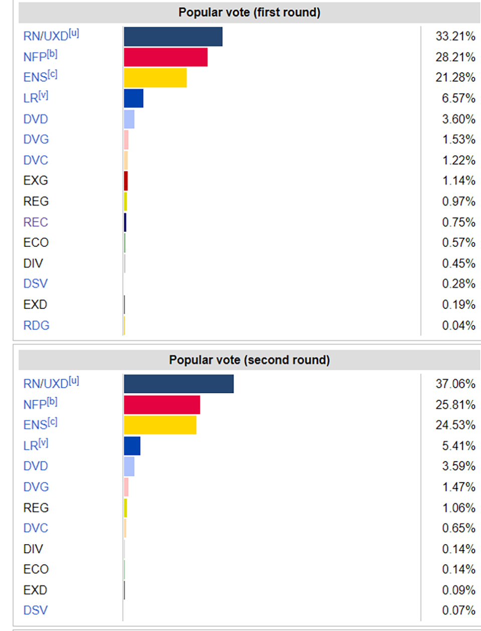 Of 178 three way second round constituency run offs between the NFP, RN and Ensemble, the NFP withdrew their third placed candidate in 99 of these, and Ensemble withdrew 79 candidates. The NFP also withdrew 27 candidates in constituencies to allow the second placed Republican (LR) with whom they have absolutely nothing in common a chance to beat the RN candidate.