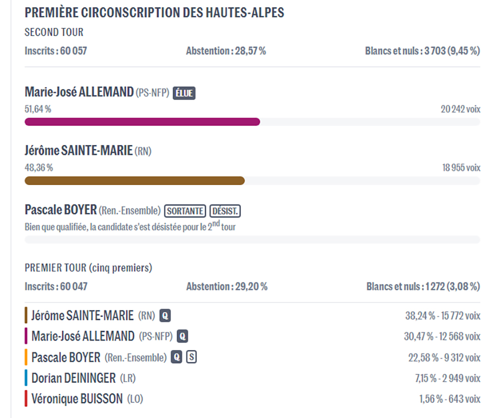 A good example of how this worked in practice was in Des Haute-Alpes where the withdrawal of the Ensemble candidate allowed the Socialist Party/NFP candidate who took 30.5% of the vote in the first round to defeat the RN candidate who had topped the poll last Sunday with over 38% and whose vote share increased to 48.4% yesterday.