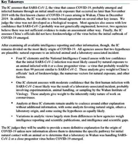 That this is not the case is evident even from the sparse detail in the declassified document. It states that “All agencies assess that the two hypotheses are plausible: natural exposure to an infected animal, and a laboratory associated incident.” The intelligence agencies concluded that it was not developed as a bioweapon, and with “low confidence” that Covid “probably was not genetically engineered.” However, two of the nine agencies believe that there is “insufficient evidence” to decide on the possibility of genetic interference.