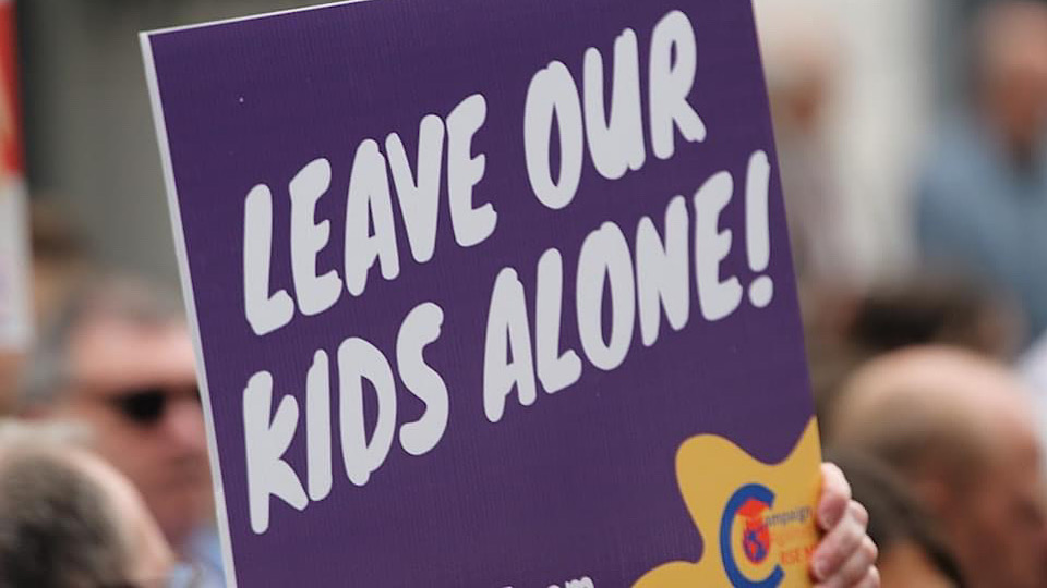 Those in attendance carried placards with the call: “Leave our kids alone!” while a banner at the front of the march was emblazoned with the words, ‘Taking a stand for our children’s future.’