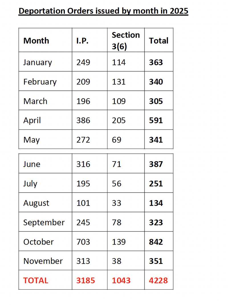 The number of deportation orders issued to the end of November at 4,228, is already on course to be twice the number – 2,403 – issued for the whole of 2024. It can also be compared to the 857 orders which were issued in 2023.