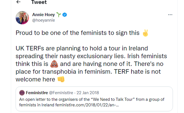 The feminist group known as The Countess, who oppose moves to have ‘genderless’ toilets in schools, and speak out against housing biologically male rapists in women’s prisons – are described as Irish TERFs by their opponents. The hostility towards them expressed and clearly shared by some who are prominent on the Irish left is common. When a British group of feminists calling themselves We Need to Talk attempted to organise a meeting here in 2018 they were opposed by several prominent Irish lefties including Annie Hoey of the Labour Party, who now sits in the Seanad alongside Lynn Boylan.