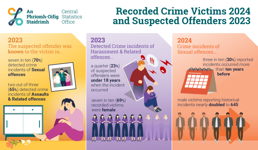 Commenting on the release, Jim Dalton, Statistician in the Crime & Criminal Justice Section, said: “Recorded Crime Victim statistics for 2024 and Suspected Offender statistics for 2023 published today show that the number of recorded male victims of crime incidents of Sexual offences increased by more than a half (54%) to 869 victims between 2023 and 2024. This rise related mainly to a near doubling, in the same period, of male victims of crime incidents of Sexual offences who reported the offence more than a year after occurrence.