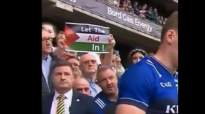 Last week’s announcement that the Israeli Government intends a full – if indefinite – occupation of the Gaza Strip, and this morning’s assassination of a man who was at minimum a Hamas-sympathising Al Jazeera employee, came despite the presence, just a week earlier, of a highly visible sign held up during the medal ceremony of the All-Ireland final: