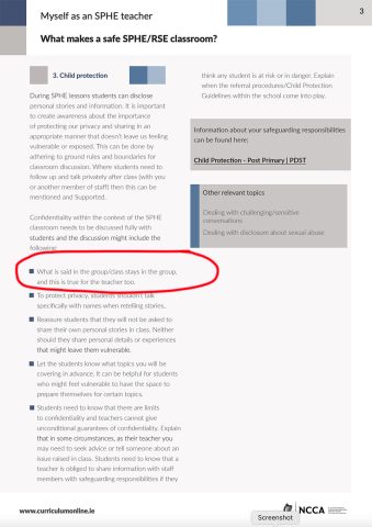 The NCCA document – What makes a safe SPHE classroom? – previously stated on page 3, under the heading of ‘Child protection’, that “what is said in the group/class stays in the group, and this goes for the teacher too.”