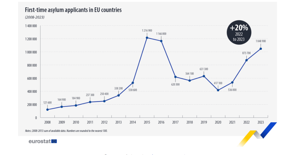 A total of 1,048,900 persons made an application for International Protection in the 27 EU states last year. This represents the third highest number ever recorded, and the highest since 2015 and 2016 when Europe was facing large influxes of people due to the war in Syria.