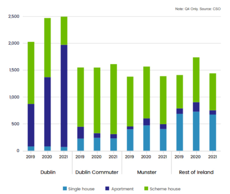 Another significant trend, and one that we have noted before, is the greatly increased proportion of housing units that are apartments. Most of these will become part of the rental market and in 2021 around 75% of housing units completed in Dublin were apartments.