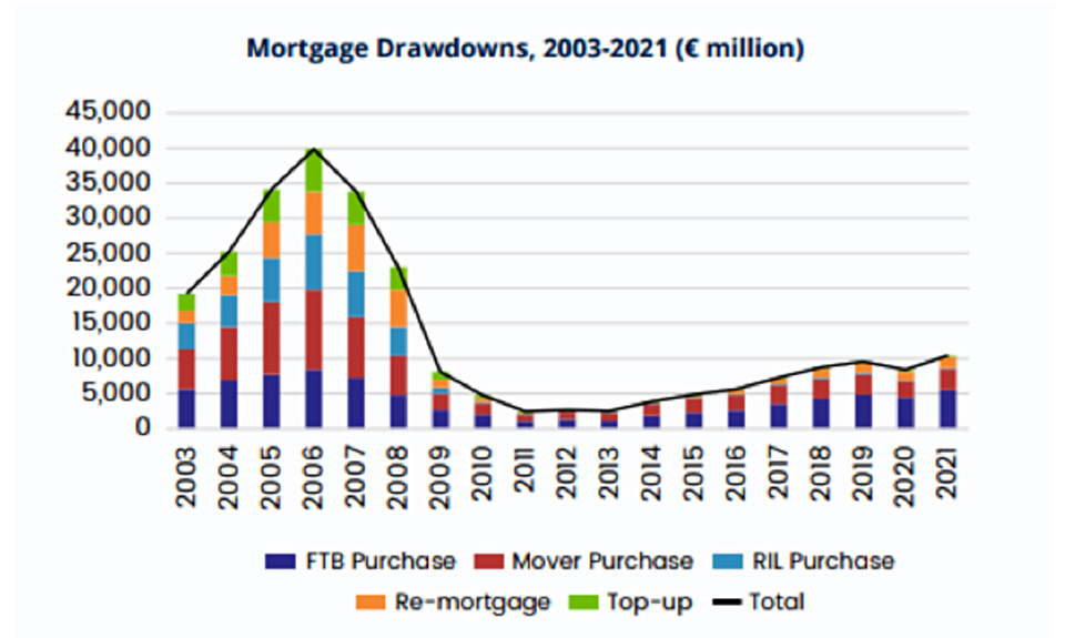 Mortgage drawdowns increased by 25% in value in 2021 compared to 2020 as the steady growth since 2013, interrupted by the Covid restrictions, has continued. The value of those 43,494 drawdowns amounted to €10.5 billion. That is equal to an average mortgage of €230,000. The value of approvals last year also increased by 30% to €13.4 billion, the highest since 2011.