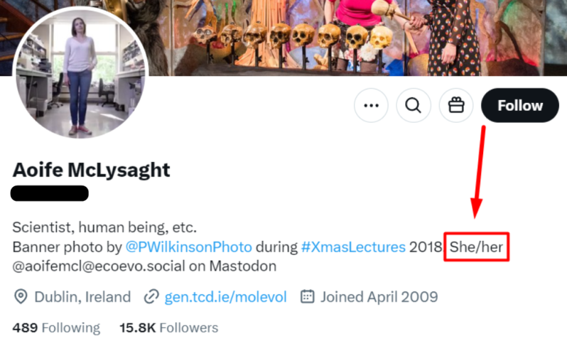 Notably, the Professor’s social media profile also features “she / her” gender pronouns.