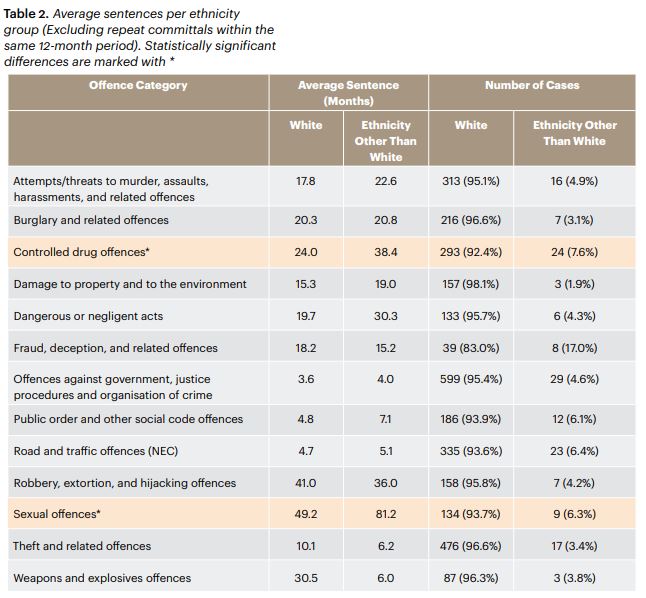 The study, for instance, says the average white prisoner will receive a sentence of 49.2 months for sexual offences, compared to 81.2 months for a non-white prisoner. But there were 134 cases of sexual offences for whites, and only 9 for non-whites.