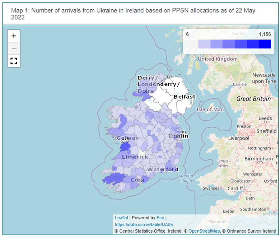 The official number released by the CSO for Ukrainians who were refugees here on May 22 was based on the issuing of 33,151 new PPS numbers by the Department of Social Protection to those from Ukraine since the beginning of the conflict. That provides some indication of the scale of the numbers, as the total of new PPSNs issues in 2021 was 174,525.