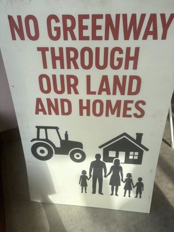 She said that the route of the proposed greenway was cutting right through family farms. A video where one local woman, whose farm has been in the family for four generations, is speaking of her upset at the prospect of the farm being ‘cut in two’ has been widely viewed locally.