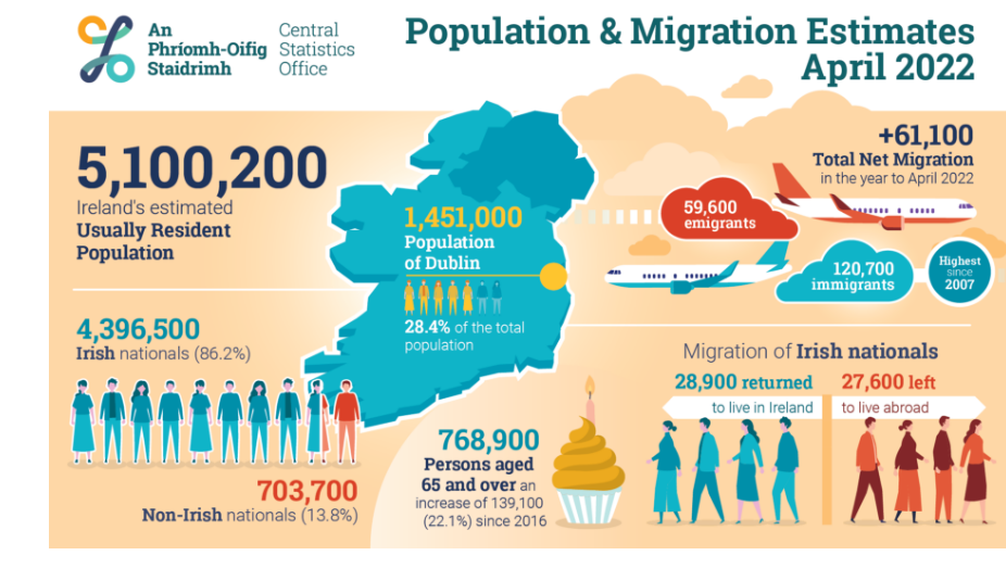 Of the 120,700 people who came to live in Ireland between April 2021 and April 2022, 28,900 were Irish nationals who have returned from living overseas. That is almost balanced by the 27,600 Irish nationals who left the country.