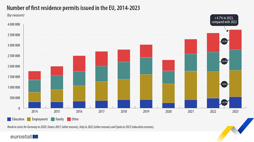 On Thursday, the EU published the 2023 figures for the granting of first residence permits to persons coming to stay from outside of the EU. They show an overall increase of 4.7% on 2022, with the total number of first permits reaching 3,741,015.