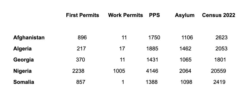The most striking statistic is that the total number of new PPS numbers issued correlates closely to the combined total of first permissions and asylum applications. A gap of just 156 in the case of Nigeria; of 252 for Afghans; 4 for Georgians; and 206 for Algerians.