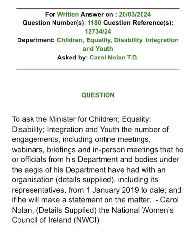 A response from Minister Roderic O’Gorman to a PQ from Rural Independent TD for Laois/Offaly, Carol Nolan, has revealed that officials from the Department of Children, Equality, Disability, Integration and Youth (DCEDIY) met with members of the National Women’s Council of Ireland (NWCI) on a total of 41 occasions between January 1, 2019 and the date of reply (20/03/2024).