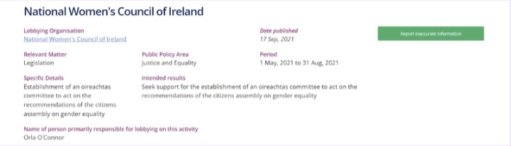 These are recorded in the register of lobbying maintained by the Standards in Public Office Commission (SIPO.) Among those lobbies was an unsuccessful attempt “to secure representation” for the NWCI on the Pensions Commission to ensure that “gender issues” were included as part of their remit. This lobby took place prior to the appointment of the Commission in November 2020.