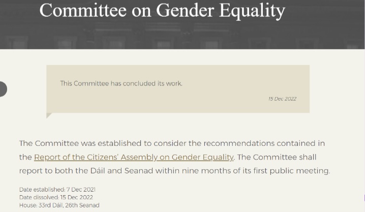 Such a Committee was indeed established in December 2021, and sat until December 2022. It was chaired by Labour Party leader Ivana Bacik and published a report which not only recommended that Article 40.1 and Article 41 be amended, but which also suggested a specific wording for the proposed changes which the Committee said should be put to referendum in 2023.