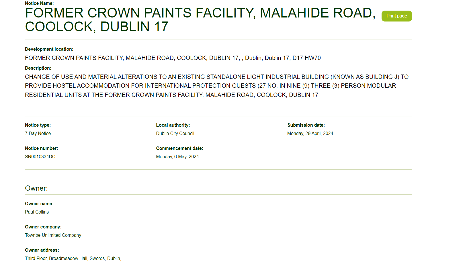 The owner is given as Paul Collins and the owner company listed as Townbe Unlimited which has an address at Broadmeadow Hall, Swords.