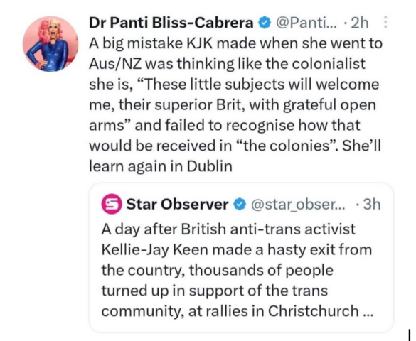 Activist Panti Bliss has been slammed online for tweets he made in relation to a women’s rights campaigner who was attacked at a rally in New Zealand last Friday.
