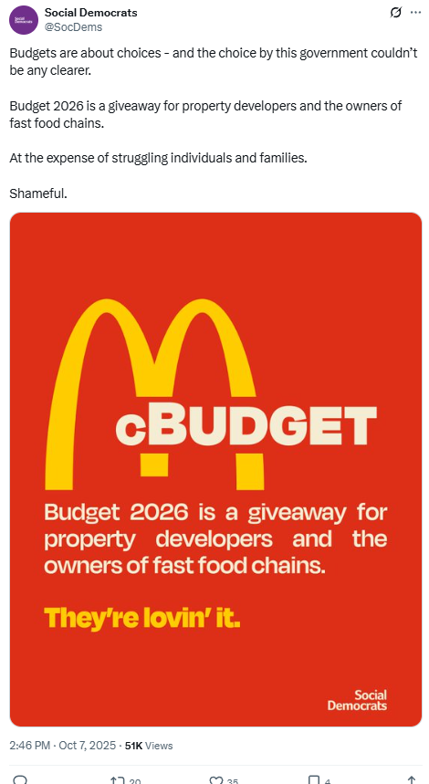 “Budgets are about choices – and the choice by this government couldn’t be any clearer. Budget 2026 is a giveaway for property developers and the owners of fast food chains. At the expense of struggling individuals and families. Shameful.”
